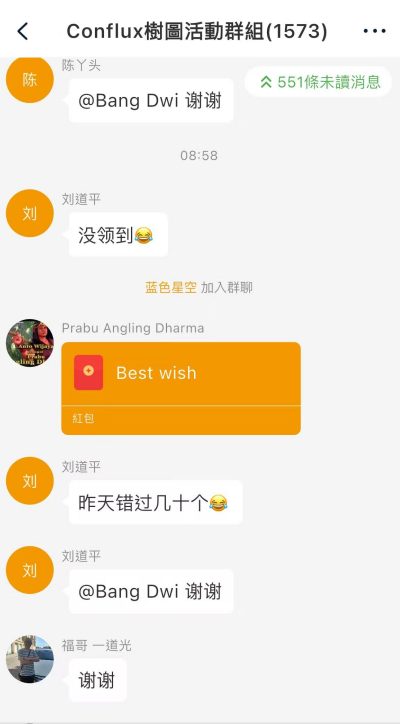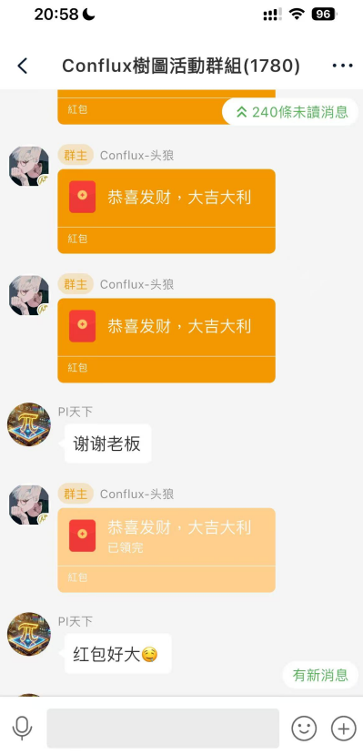 以Conflux項目方的合作為例:在TELTLK千人群組中發起CFX代幣「紅包雨」,用戶入群即可拆紅包。